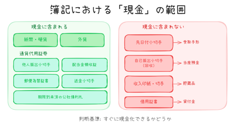 ポイント1:現金の範囲 簿記上の『現金』は、通貨(紙幣、硬貨、外貨)と通貨代用証券(他人振出小切手、配当金領収証など)の合計額です。先日付小切手は『受取手形』、自己振出小切手の回収は『当座預金』の戻入れとして処理し、現金には含めません。