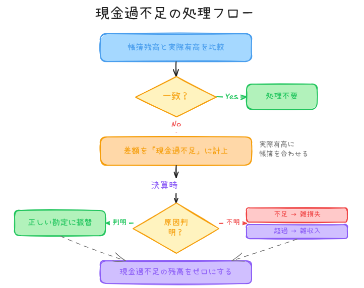 ポイント3:現金過不足の処理 現金の実際有高と帳簿残高が異なる場合、帳簿を実際有高に合わせる修正を行い、差額は一時的に『現金過不足』として処理します。